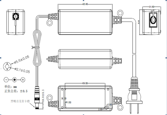 技術(shù)參數(shù) | 顏色黑色安裝方式兩端帶線式輸入規(guī)格AC100V~240V,50Hz,0.7A輸出規(guī)格DC12V/2A負載調(diào)整率±5%波紋/噪聲150mVp-p輸出功率24W Max輸入接口兩芯AC插頭(國標)輸出接口形式?5.5×2.1×11mm線長AC220V端500mm,DC12V端1000mm工作溫度和濕度-10℃~50℃,濕度10%~90%(無凝結(jié))尺寸(mm)93.4(L)*39.9(W)*31.6(H) |